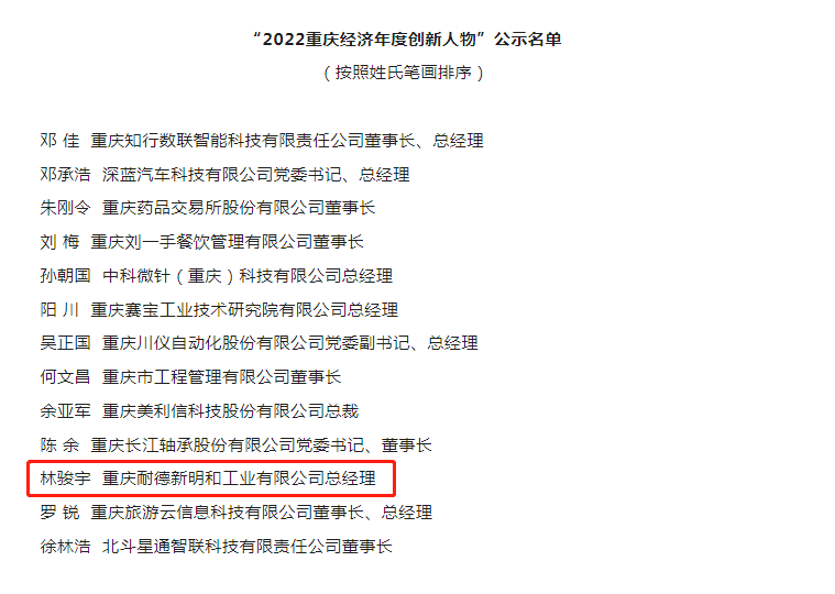 2023年8月29日,“2022十大重庆经济年度人物”评选活动终审会在重庆日报报业集团召开。“十大重庆经济年度人物”评选活动是由重庆市委组织部、市委宣传部、市委统战部指导,重庆日报报业集团联合两江新区管委会共同主办。活动作为重庆最具影响力的经济类评选已成功举办14届。经过多环节严格筛选,33位活跃在重庆经济建设第一线的年度人物最终脱颖而出,重庆j9九游会新明和工业有限公司总经理林骏宇先生荣获“2022重庆经济年度创新人物”殊荣。